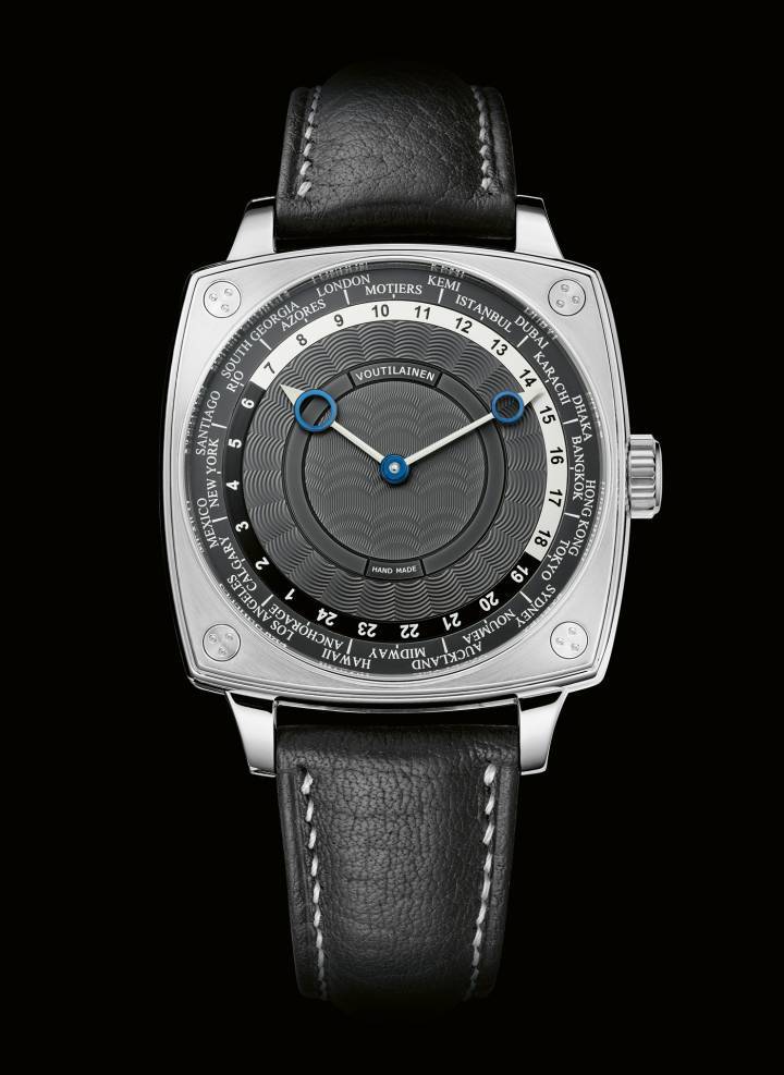 La nouvelle Worldtimer que Kari Voutilainen présente aujourd’hui en étonnera plus d’un. Avec son fort boîtier coussin en acier de 39 x 39 mm et de 12 mm d’épaisseur, ses quatre vis spéciales qui fixent la lunette (quatre vis identiques fixent le dos de la montre), les jeux de gris de son cadran, elle arbore une modernité audacieuse à laquelle le classicisme formel de Voutilainen ne nous avait guère habitué.