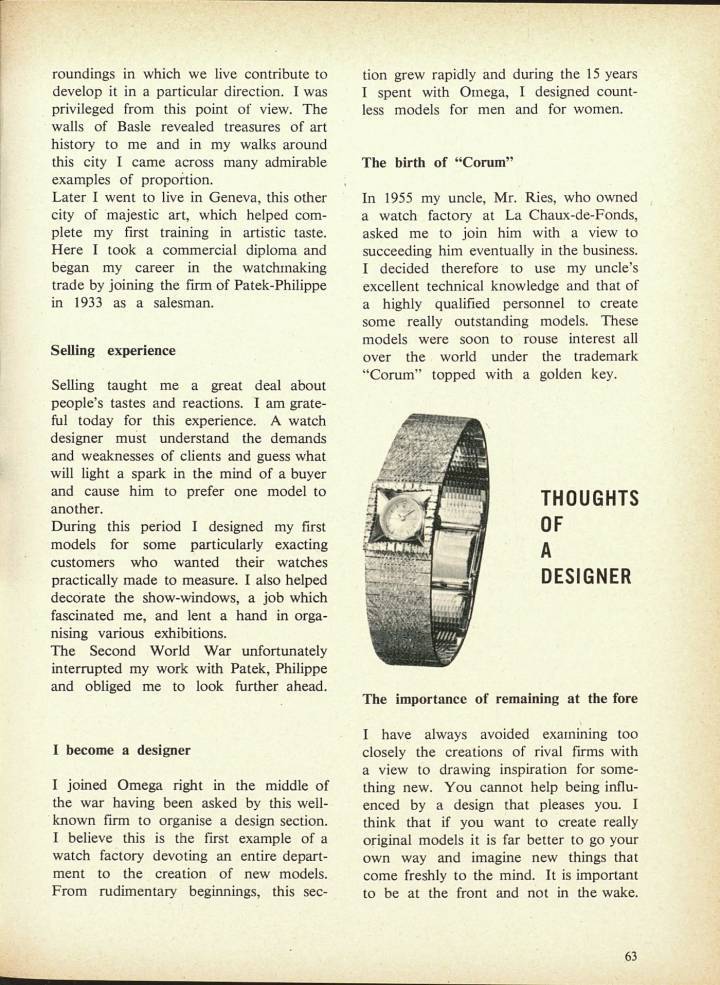 - Entretien avec René Bannwart, fondateur de Corum, paru en 1963 dans Europa Star. Celui-ci a commencé sa carrière au sein de la première unité de design d’Omega en 1940.