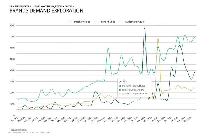 Un podcast du Digital Luxury Group a analysé les recherches Google sur les marques de montres au moment du mariage Ambani en juillet 2024, qui a retenu l’attention des médias internationaux. Selon ses données, cet événement a entraîné une forte augmentation des recherches pour Audemars Piguet, Patek Philippe et Richard Mille. Cela prouve, si besoin était, que les événements culturels importants stimulent la demande pour les marques de montres.