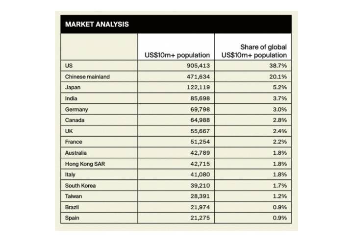 L’augmentation de la population des particuliers très fortunés (ceux dont la fortune nette est d’au moins 30 millions de dollars) est encore plus marquée. Toujours selon Knight Frank, cette population augmentera de 58,4%, passant de 12’069 en 2022 à 19’119 en 2027.