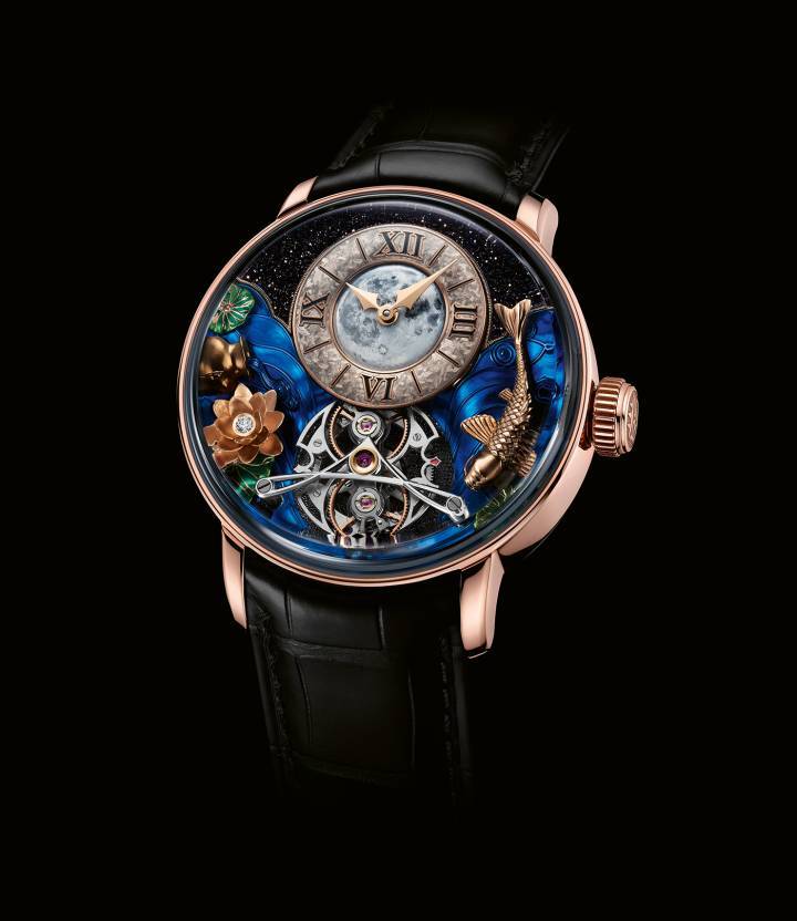 - Hymne d’Orient est une pièce unique dont le cadran a été entièrement gravé par le talentueux Olivier Kuhn. Il représente une scène symbolique où figurent une carpe koï aux petites moustaches d’or, une fleur de lotus, déesse de l’eau, un ciel d’aventurine et une lune très réaliste au centre du cadran.