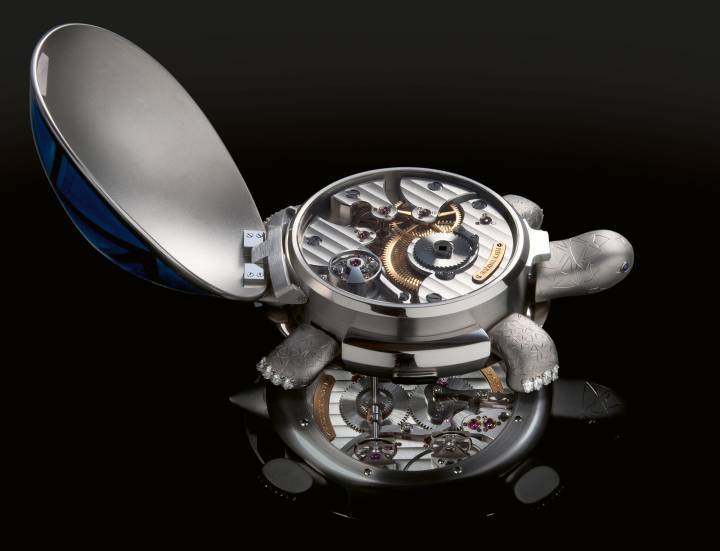 - Les 300 composants du mouvement de l’automate «Tortue» ont été réalisés artisanalement dans le plus grand respect des traditions horlogères. Finitions anglage main, guillochage, Côtes de Genève. Carapace gravée et émaillée par des artisans de la région. La carapace, les pattes et la tête sont en or 18 ct. Les griffes sont serties de diamants et les yeux ornés de saphirs. La Tortue se remonte à l’aide d’une clé puis avance en bougeant les pattes et la tête. Pièce unique.
