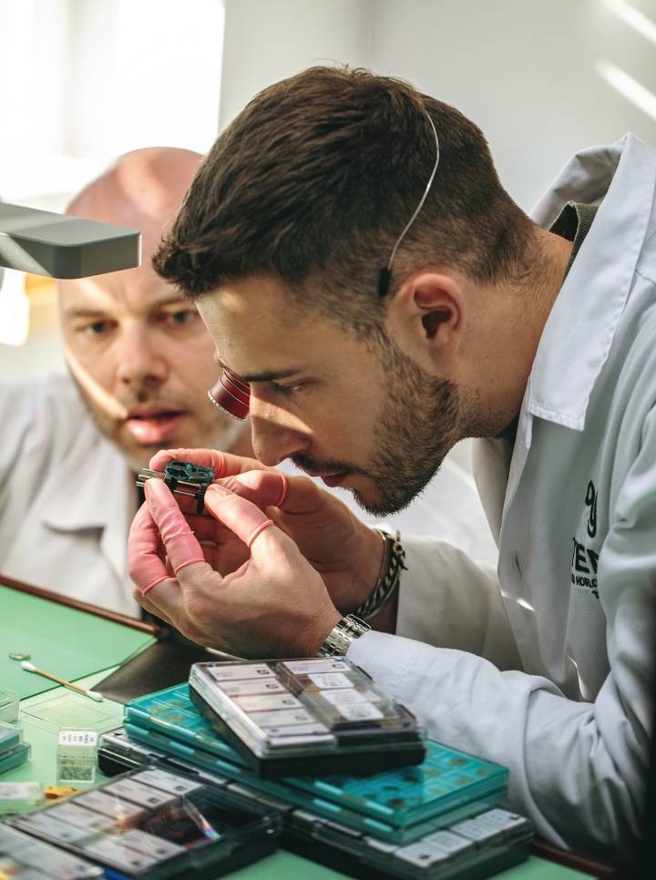 - Olivier mory, le concepteur du calibre micro-rotor de Yema observe les réactions de Nicolas Bailly, responsable technique & qualité de la maison.