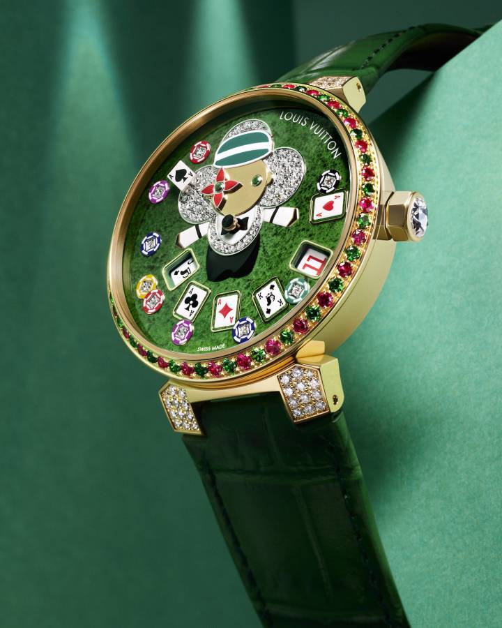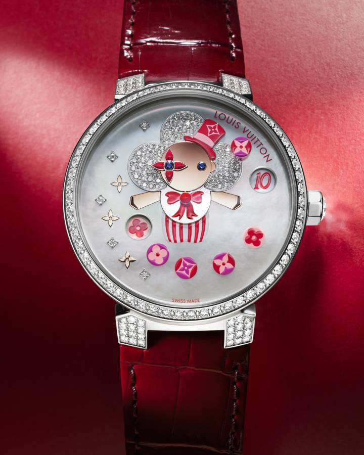 Dans un tout autre registre, voici également la Tambour Slim Vivienne Heures Sautantes. «Vivienne», c’est le nom d’une figurine espiègle et énigmatique qui a fait son apparition dans l’univers créatif de Louis Vuitton en 2017.