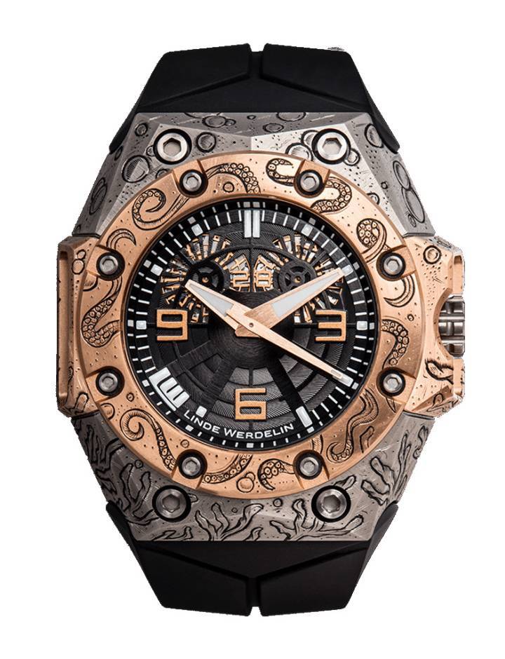 - La SpidoLite Ripples combine la montre la plus complexe sur le plan technique de Linde Werdelin avec les «embellissements poétiques» du graveur Joanne Ryall. La montre dispose d’un boîtier entièrement squeletté en or rose 18 carats, en carbone forgé et en alliage Linde Werdelin «ALW», un métal de l’aérospatiale développé pour atteindre une réduction de poids et une résistance optimales. La gravure de la montre est inspirée par la petite série de vagues qui apparaissent à la surface de l’eau ou de la neige lorsque souffle une légère brise. De 10,000 à 20,000$