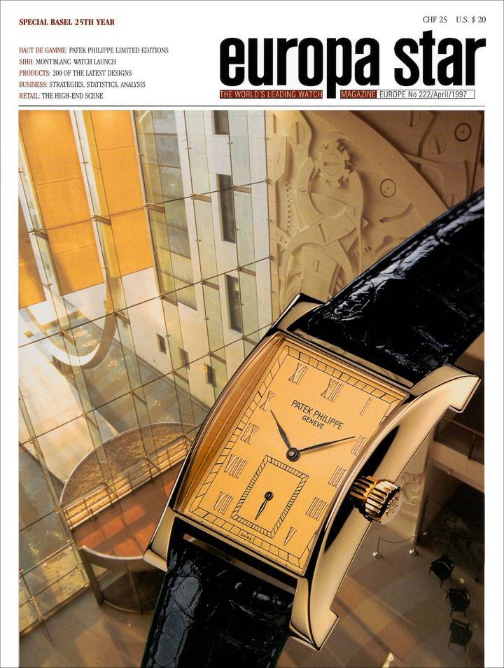 - A l’occasion de l’inauguration de la nouvelle manufacture, Patek Philippe présente la Gondolo, une pièce inspirée des designs des années 1940. Ici en couverture d’Europa Star 2/1997, sur fond du hall d’entrée de la manufacture.