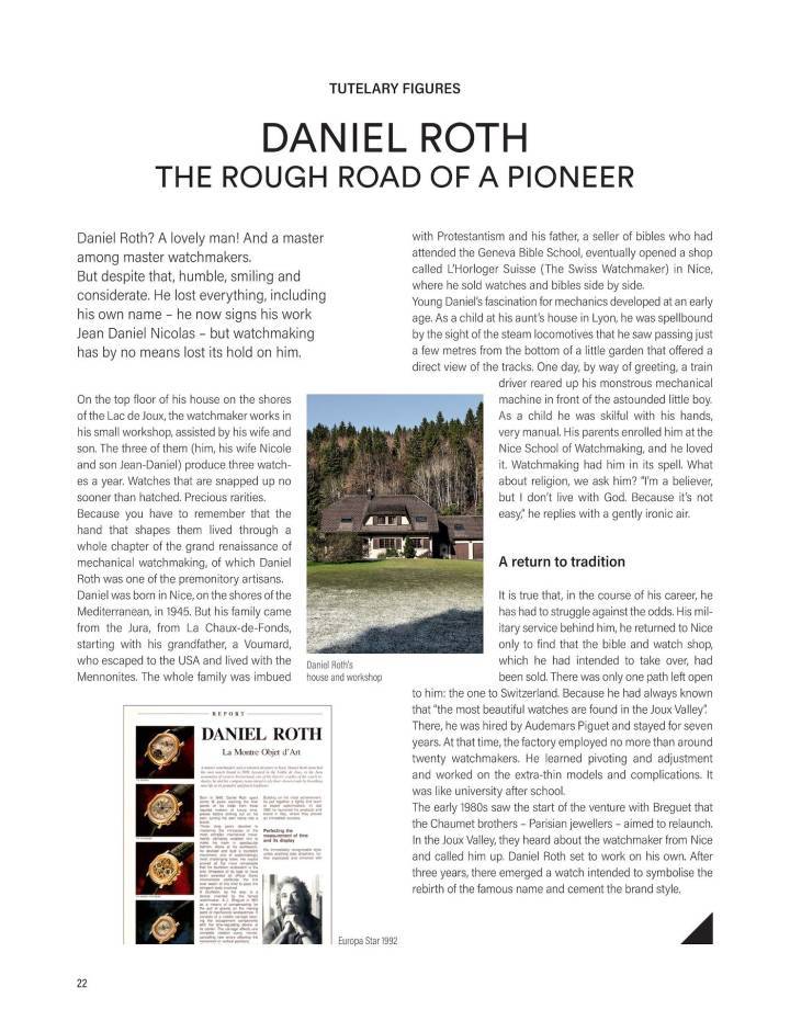 - Un portrait de Daniel Roth paru en 1991 dans Europa Star: l’horloger est alors à la tête d’un atelier réunissant les meilleurs savoir-faire de l’époque. Il participe activement à la renaissance de la montre mécanique, qui mènera in fine à la domination de la Haute Horlogerie que l’on connaît aujourd’hui.