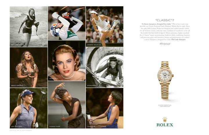 Toutefois, J. Walter Thompson est consciente des limites d’un tel positionnement. Elle le communique à son client: «Nous savons qu’une Rolex n’est pas une montre pour dames» (lettre de JWT à Montres Rolex SA, 1953). Elle propose dans un premier temps de viser les femmes qui partagent des valeurs similaires aux hommes, comme «les femmes qui rivalisent avec les hommes dans les affaires [et] les femmes qui s’intéressent au sport». C’est ce qui mène par exemple à la mise sur le marché d’une version féminine de la Datejust en 1957.