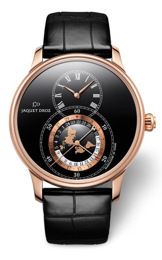 - Jaquet Droz 26M5R, chronographe monopoussoir, mouvement mécanique à remontage automatique, spiral et cornes d’ancre en silicium, barillet unique, roue à colonne, masse oscillante en or rouge 18 carats. 40 heures de réserve de marche.