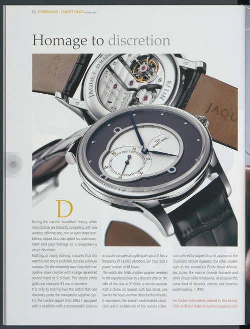 - La Grande Seconde, telle qu’elle apparaît dans Europa Star 2/2002. Boîtier en or blanc et cadran ivoire en émail grand feu. La matrice stylistique de Jaquet Droz est née.