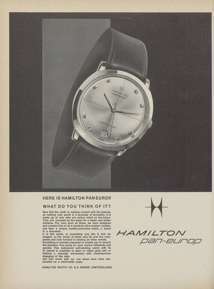 - Une annonce d’Hamilton pour son modèle Pan Europ dans une édition de 1963 d’Europa Star, alors que la marque aux origines américaines venait de déménager à Bienne.