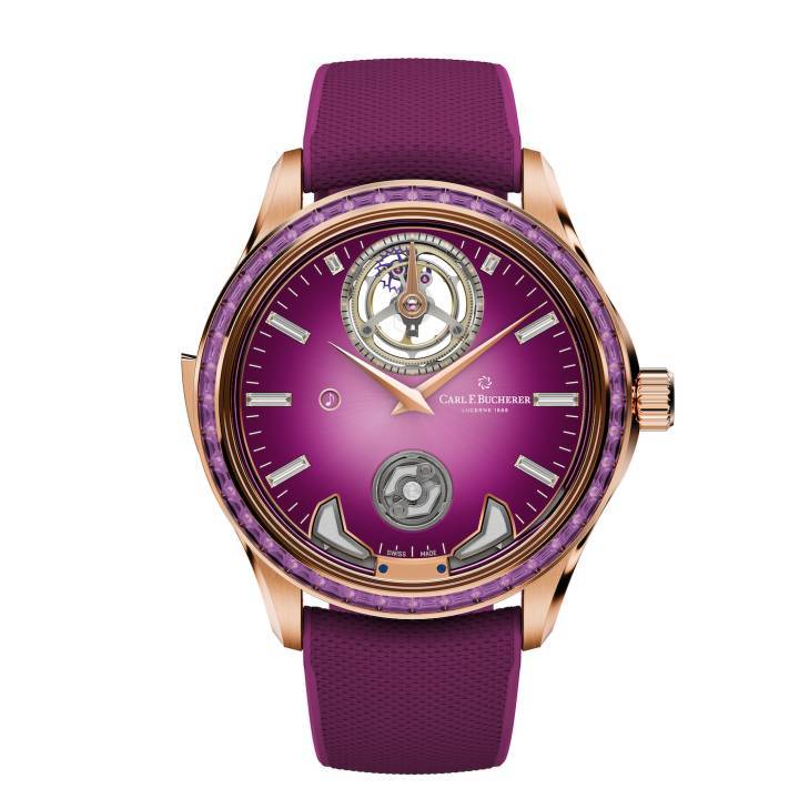 Cette «Rainbow Watch» est éclairée de 40 pierres précieuses taille baguette, dont des tsavorites, des saphirs et des rubis qui composent une lunette multicolore. Chaque pierre est sélectionnée pour obtenir une transition imperceptible avec la couleur de sa voisine. Munie d’un boîtier en or rose 18 carats, la montre présente deux éléments brevetés par Carl F. Bucherer: un système de remontage automatique et une cage de tourbillon suspendue qui semble flotter dans les airs. La complexité de cette œuvre couplée à la rareté des pierres en fait une édition ultra-limitée à 18 exemplaires (140’400 euros, soit la référence la plus chère de la marque).