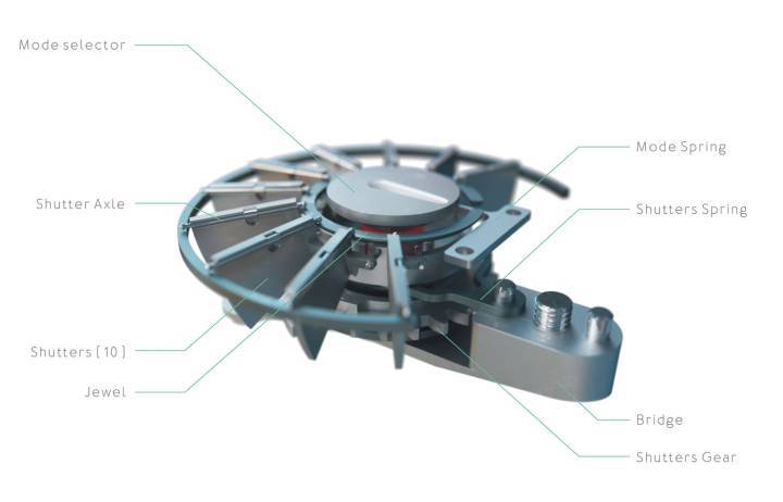 Son énergie est produite par les mouvements au porter d’un générateur cinétique qui possède son propre barillet et, si nécessaire lorsque la montre est au repos, par des cellules photovoltaïques dissimulées derrière 10 micro-volets ouverts sur le cadran. Réglée manuellement une seule fois au départ par le biais d’un petit levier situé au dos du boîtier, l’heure est ensuite vérifiée et ajustée automatiquement par le dispositif électronique qui la contrôle au moins une fois par jour.