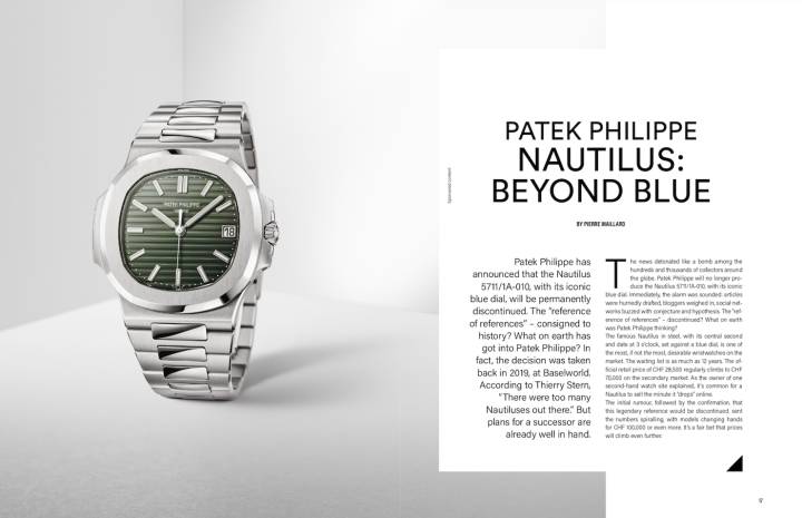 Ce numéro, dont la couverture présente la toute nouvelle version de la très recherchée Nautilus de Patek Philippe, est consacré à la communauté en plein essor des collectionneurs de montres. Qu’il s’agisse de modèles à 100 francs ou à 100 000 francs, la collection de montres s’est véritablement démocratisée grâce à la fluidité culturelle et commerciale de l’ère numérique. Tout le monde peut désormais posséder une part du rêve, revendiquer une expertise spécifique, adopter un certain angle.